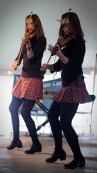 These talented youngsters have made quite a name for themselves performing at shows for delighted audiences and competing at contests throughout Ontario and in the northern United States. "Tessa Bangs and her nine-year old sister, Ella, were joined by their guitar-playing father, Robert, for a terrific medley of fiddle duets and step dancing. This set was worth the price of admission all by itself." Richard Todd © The Ottawa Citizen 2006 |