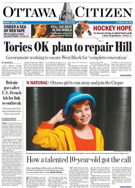'A Natural': Ottawa girl to run away and join the CirqueRoger Collier, The Ottawa CitizenPublished: Monday, August 06, 2007 How a talented 10-year-old got the callAfter a gruelling audition process, Ella Bangs is about to experience an adventure most of us can only dream about, writes Roger Collier.For Ella Bangs, a 10-year-old on the brink of a magical journey, it all began 10 months ago in the kitchen of her Orleans home when her mother pushed play on the answering machine. "I'm listening to this message," says Lauree Bangs, "and my jaw is on the floor." Her daughter, Ella, standing nearby, wondered what had gotten into her mother. "I thought we won the CHEO dream home," she says. The message had been left by Julie Barron, a talent scout for Cirque du Soleil. She wanted to know if Ella was interested in pursuing the role of Zoé, the lead character in Quidam, a show that has been touring the world since 1996. Interested? Oh yes, Ella was very interested. Two months and three auditions later, Ella landed the part. She will soon be flying to Shanghai to train and then to Mexico to join the tour. And her entire family is going with her. While Ella has never done anything quite like this, the bubbly girl with braces on her big smile is no stranger to the stage. Ella and her 12-year-old sister, Tessa, have been performers for more than half their lives. They enter fiddling and step-dancing competitions all over Ontario and the northern U.S. And they enter to win, which, as evidenced by the nearly 100 titles they've accumulated, they often do. When they aren't performing themselves, the sisters enjoy watching others perform. In spring 2006, they watched a talented troupe display its skills at Lansdowne Park. The troupe was from Cirque du Soleil. The show was called Quidam. | |